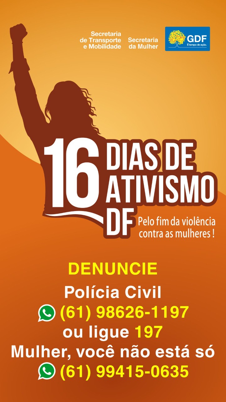 Também estão sendo exibidos no totens da rodoviária os números de telefone por meio dos quais as mulheres podem denunciar uma agressão (Polícia Civil e o 197), além do contato do programa Mulher, Você Não Está Só (61- 99415 0635), um canal de teleatendimento criado pela Secretaria da Mulher, durante a pandemia, para que vítimas de violência que não podiam sair da casa por causa do isolamento social pudessem ter um canal para denunciar o agressor.